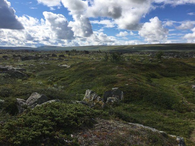 Från Kvikkjokk började vi med att åka 4 km båt till där leden tar vid igen. Sedan väntade flera kilometers stigning genom skog och på stigar som hade svämmat över av allt regn. I Tsielekjåkkstugan tog vi lunch och sedan färden fortsatte upp på kalfjället. Här fick vi skåda panoramavyer och vandra på jättefina stigar. Målet för denna dag var att finna en tältplats vid broarna vid västra Västerfjäll. De två efterföljande dagarna har bjudit på fin vandring och även solen har visat upp sig.
