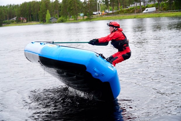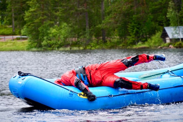 Niclas kämpar för att ta sig tillbaka i raften/gummibåten.