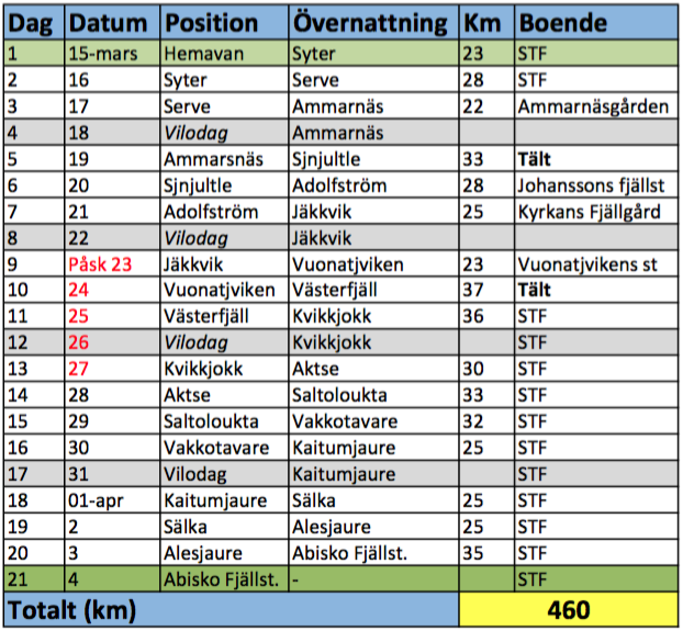 Här följer våra planerade dagsetapper längs Kungsleden. Vi åker turskidor och drar pulka, vilken väger cirka 40 kg. Beräknad hastighet är 3 km/h. Från den 15 mars i Hemavan är dagsljuset ca 12 h och varje dag blir det minst 7 minuter ljusare (längre dagar). Vi har med oss pannlampor och siktar på att hellre starta tidigt i mörker och ha hela dagen framför oss än tvärtom.