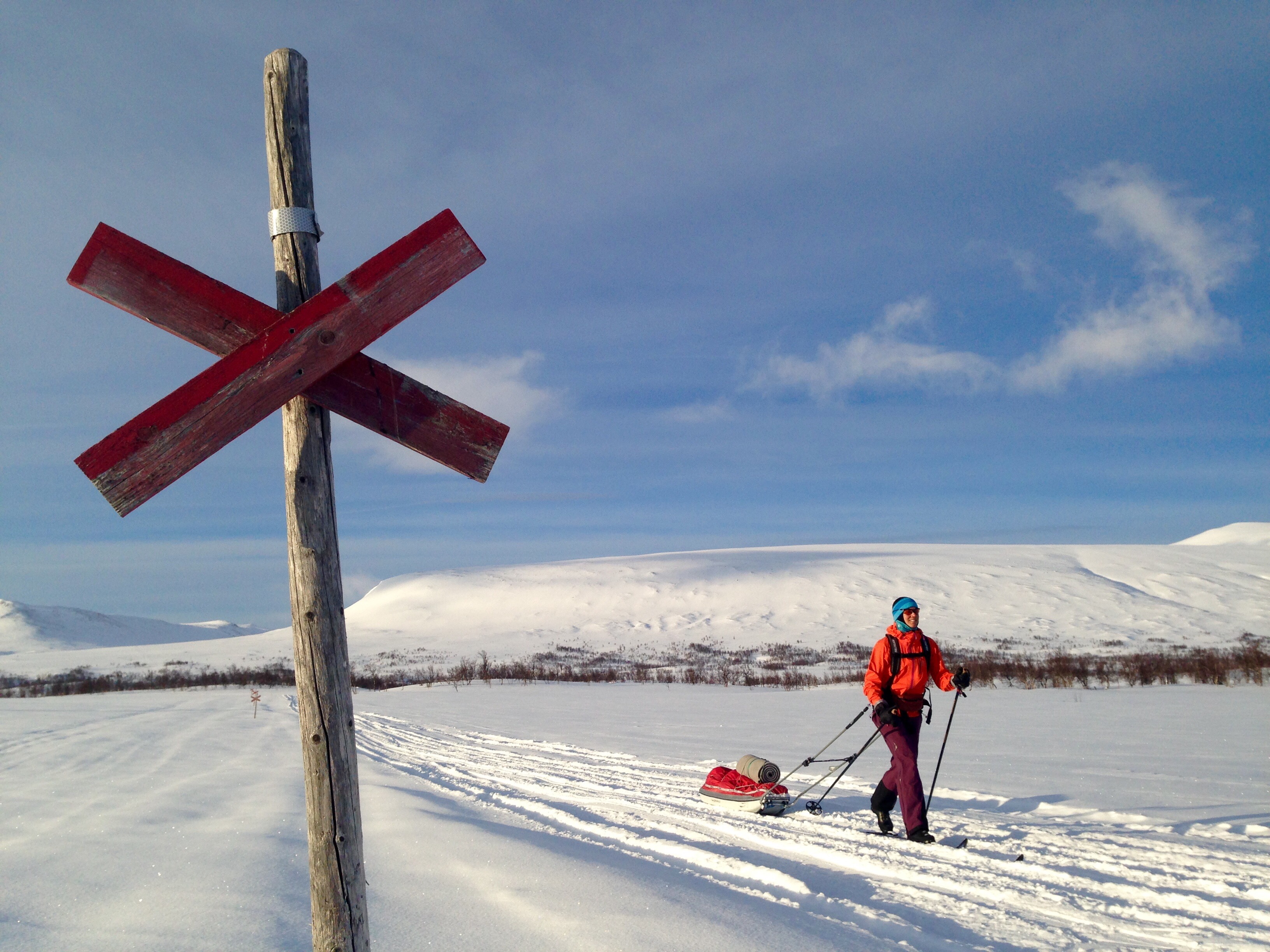 Från Edsåsdalens skidparkering är det ca 5,5 km till Lyckans läger. Terrängen dit är lätt uppför och går mestadels genom skog. Hela sträckan följer kryssleder, men skyltningen är inte jättebra. Karta och kompass krävs (som vanligt när man är ute på fjället). Foto: Linnea Nilsson-Waara