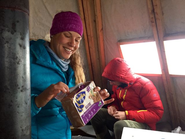 Vår mat för dagen väger cirka 800-900 gram och ger i snitt 3500 kcal per person exklusive 2-4 liter vätska innehållande vätskeersättnings- och energipulver. Vi bär med oss torrmat i form av frukost (600 kcal), lunch (650 kcal) och middag (650 kcal), som kompletteras med 3-4 bars (200 kcal/st), två nötpåsar (200 kcal/st), två påsar torkat kött (70 kcal/st) och två chokladsticks (120 kcal/st), vätskeersättnings- och energipulver (200 kcal), samt torrkaffe (0 kcal).