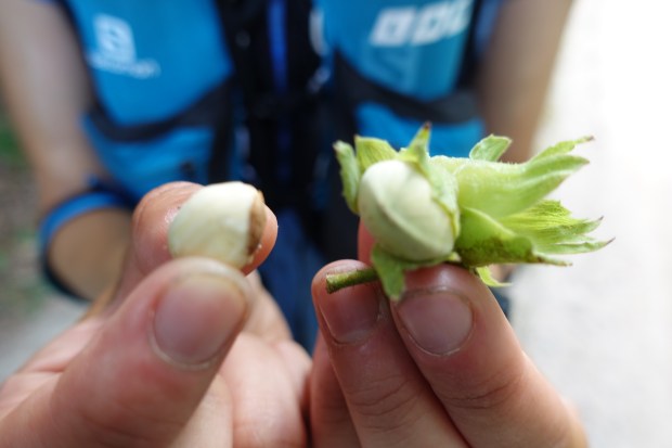 Hasselnötterna går äntligen att äta! Vi har väntat hela sommaren. Foto: Oscar Detmer Nilsson.