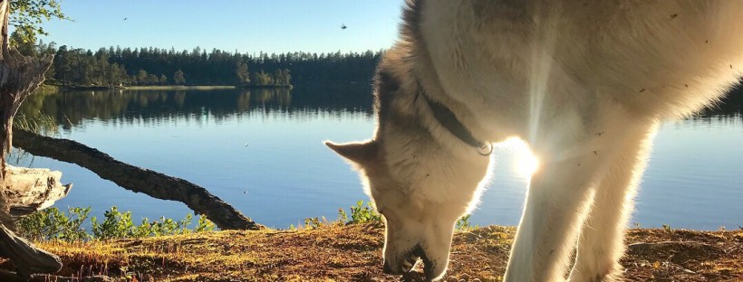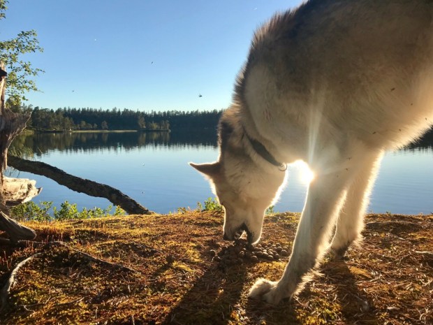 Storm har skött sig jättebra och verkar trivas med turlivet. Ibland fumlar han runt i kanoten så att det svänger, men efter en stund blir han less och lägger sig. Han är jätteduktig.