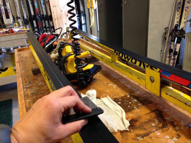 • Alternativ 3, vilket är det bästa, är att droppa på mjukt paraffin (lämpad för + 10 grader), strykjärna ut och omgående sickla bort det. Nu följer smutsen med och skidans struktur hanteras varsamt.