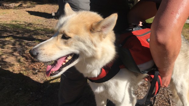 Paddelträning i kanot och test av torrdräkter genomföre vi under våren. Även att träna Storm på att vara i kanot och vänja sig vid flytvästen. Foto: Roger Strandberg
