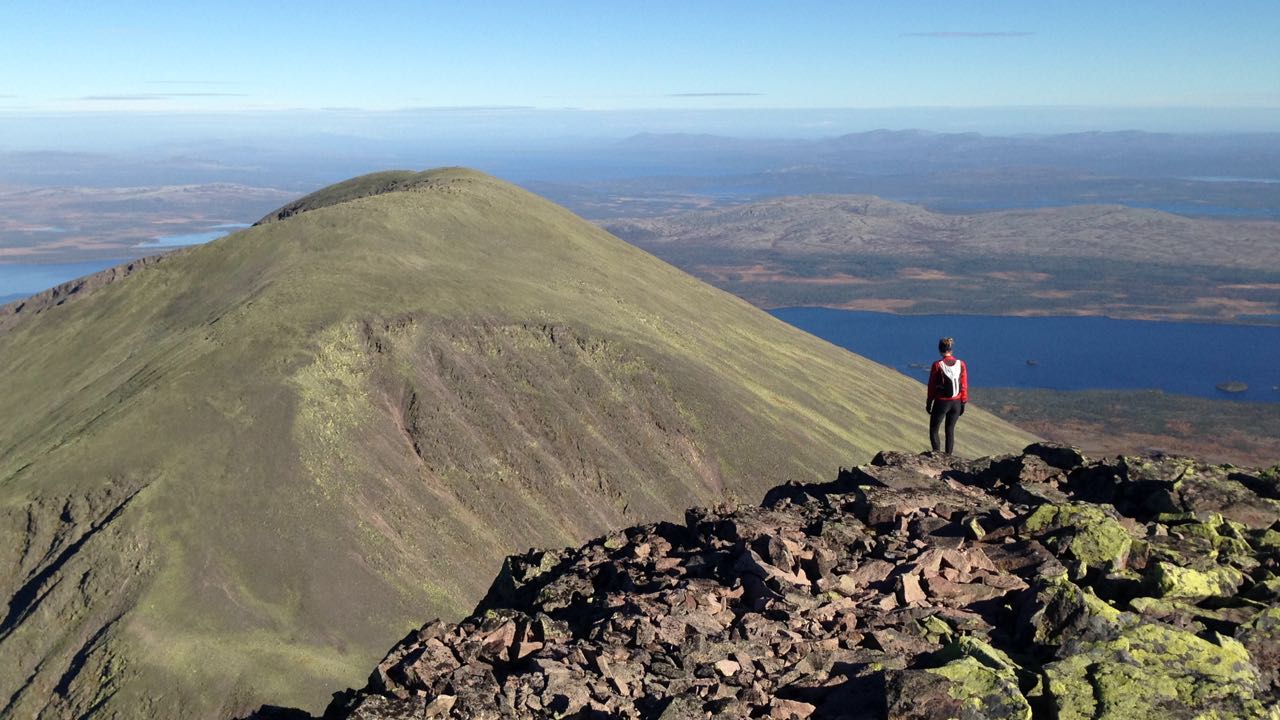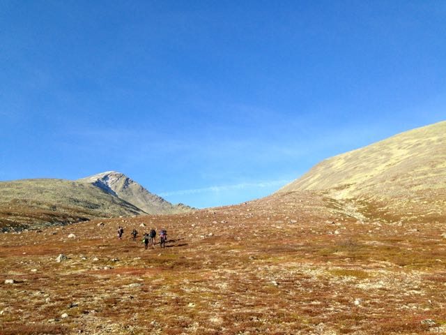 En hel flock med äventyrselever tar sig ned för fjället. Belöningen efter att ha klättrat sig upp på toppen. Foto: Dennis Franzén.