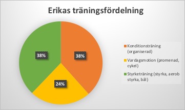 ERIKA: Fördelningen mellan konditions- och styrketräning utgör 38% vardera. Vardagsmotionen utgör nästan en fjärdedel. Antalet träningsformer har varit 14 stycken. Den vanligaste är bålstabilitet på 20%, som följs av promenad 14%, CrossTrainer 13%, löpning 13%, Tabata/cirkelträning 12%, cykling 11% och styrketräning 6%.