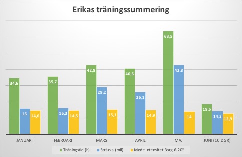 Desto närmare start har träningen övergått mer mot lågintensiv träning och mer fokus på tid- och mängdträning, samt att börja springa/promenera med packning. All träning vi har kunnat få in har varit väsentlig. Därför har vardagsmotionen ökat drastiskt under maj och juni månad.