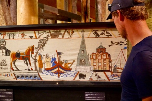 Vi paddlade ett par kilometer nedströms. En bit efter Vingängsjön lade vi till på en liten sandstrand jämte en vit eka. Vi följde stigen ett par hundra meter och hamnade inom kort i Ransby och Utmarksmuseét. Där finns Pilgrimstapeten att beskåda. En 40 meter lång bonad broderad på linneväv med garn av ull. Bonaden skildrar Pilgrimsleden från Hammarö till Nidaros (dagens Trondheim) dit människor vandrade för att besöka Nidarosdomen och Olav den Heliges grav.