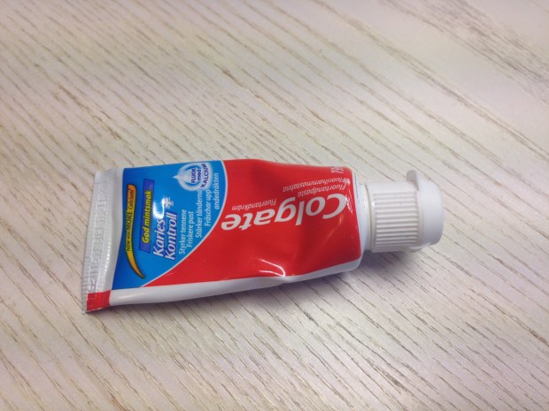 Små tandkrämstuber är lättare och räcker i ca 3-4 dagar för två personer.